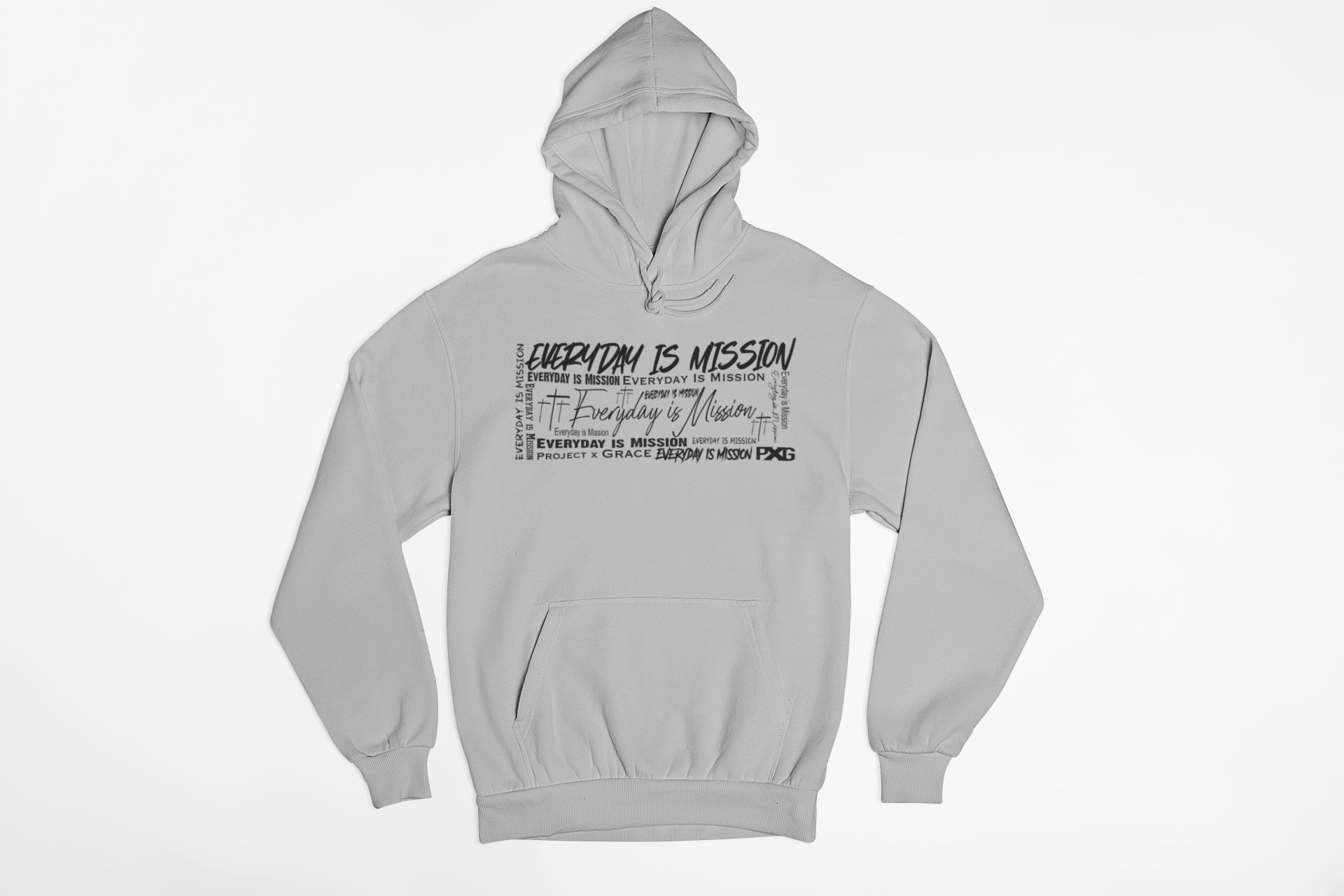 Black or Gray hoodie with the words "Everyday is Mission" in various fonts and sizes.